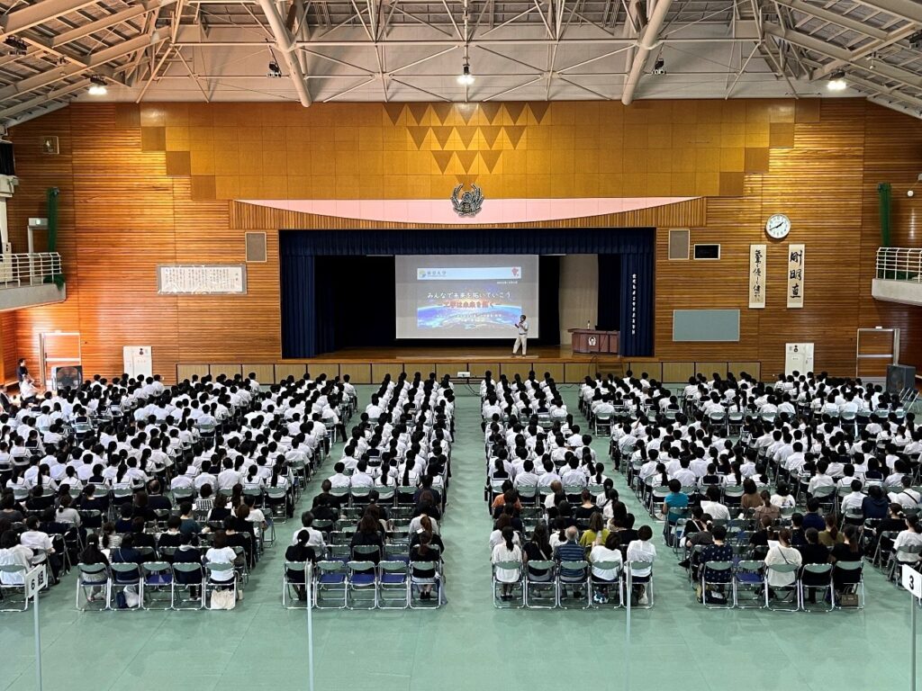 当日は体育館に高校1年生・2年生約640名と保護者様約150名にお集りいただきました。これからの進路に悩む多くの生徒さんが真剣な表情で講演に参加されていました。講演後の感想には、「目先の文理選択にばかり気をとられていましたが、大学では好きなこと、学びたいことに挑戦することが重要と知りました」、「初めて目にした工学研究内容はどれも驚きでした。東京大学へ進学して社会のために貢献できる工学研究を実際にやってみたいと感じました」といった声が多く寄せられました。また「加藤先生の学生時代から研究者になるまでの道のりと、日本のために常にポジティブに活躍する姿にとても憧れを感じました」、「私も加藤先生のように自分の置かれた環境でひたすら努力を続ける人間でありたいと思った」など自分の視野が大きく広がったという感想もいただきました。保護者からも「宇宙資源やレアアースなど、私が学生の頃には聞くこともなかった学問や研究を知ることができ、壮大な話は聞いていてワクワクしました。今後、子供にも探究心を持って、自分の興味のある分野に突き進んでほしいと思いました」と参加いただいた皆様より感謝の声をいただきました。