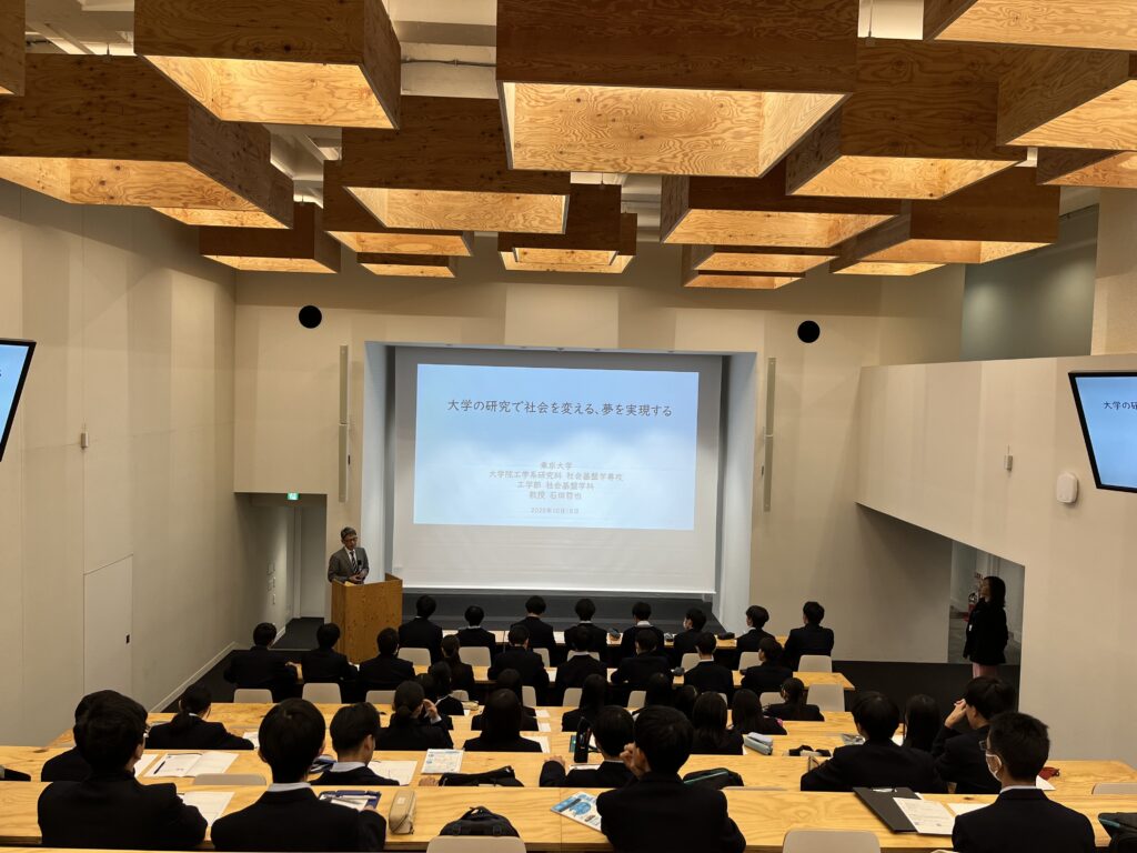 甲府東高等学校の生徒の皆様が東大本郷キャンパスを訪問されました。社会基盤学専攻石田哲也先生より「大学の研究で社会を変える、夢を実現する」の講義が行われました。「工学とは何か?」のテーマで工学部16学科の説明や、先生の研究である「コンクリートとは何か?‐地球上で水の次に使われている資源‐」のテーマではミニクイズを盛り込みながら幅広く説明いただきました。「理学部との違いを学んで、より工学部に興味を持ちました」「研究をするならレベルが高く環境が良い大学を選ぶべきだと感じたので、これからの勉強を益々頑張りたいと思います」と生徒の皆様からは前向きな感想をたくさんいただきました。