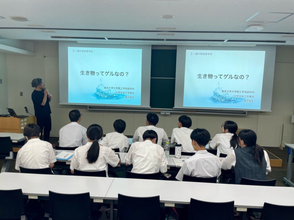 宮崎県五ヶ瀬中等教育学校・五ヶ瀬高等学校の生徒の皆様が東大本郷キャンパスを訪問されました。バイオエンジニアリング専攻の酒井崇匡先生より、「ゲルとは?」「ゲルで医療を革新する」のテーマで「生き物ってゲルなの?」の講義が行われました。生徒の皆さんからは、「ゲルの実用化の発想が自分では思いつかないようなばかりで驚きました」「研究設備が整っていてすごかったです。こんなところで研究してみたいと思いました。」と驚きと喜びの感想をたくさんいただきました。初めて訪れた東大の広さや建物の素晴らしさにも感動していただき、充実した1日となった様子でした。