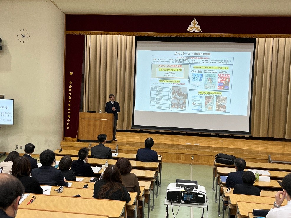 会場となりました盛岡第一高等学校には、八戸高校、弘前高校、青森高校、秋田高校、盛岡第一高校の先生方にお集りいただきました。工学系研究科社会基盤学専攻の石田哲也教授より『工学が拓く未来―知の広がりと社会実装―』というテーマで行われた講演会の感想には、「自分は文系で理解できるか不安だったが、非常にわかりやすく興味深かった」という感想や「日本のインフラ整備に対する新しい視野が開けた」という声もあり、研究内容が教育現場にとっても具体的な理解につながったという声を多数いただきました。他にも「東京大学を目指す生徒だけでなく、すべての生徒に聞かせたい内容だった」「今回の学びを踏まえ、どのような人間になっていくべきかを生徒にもっと伝えたい」など、生徒のキャリア形成に直結する内容として大変好評でした。今後も、生徒が自らの学びと未来を主体的に選び取れるよう、学校と大学が連携しながらサポートしていくことの重要性を改めて感じていただけた講演となりました。